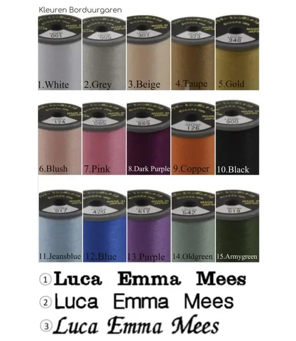 Vul hier de borduur gegevens in; Naam, lettertype en kleur garen.